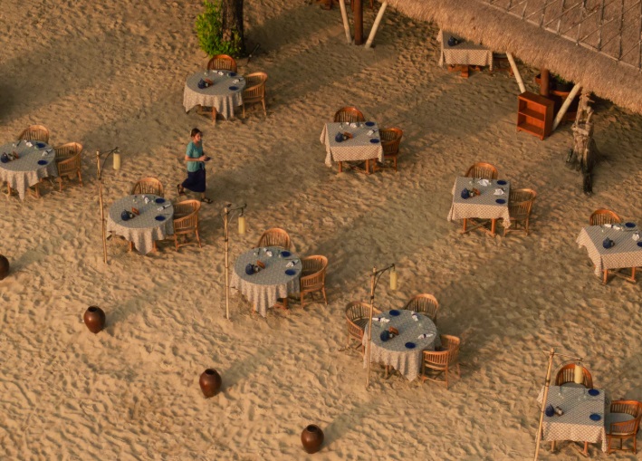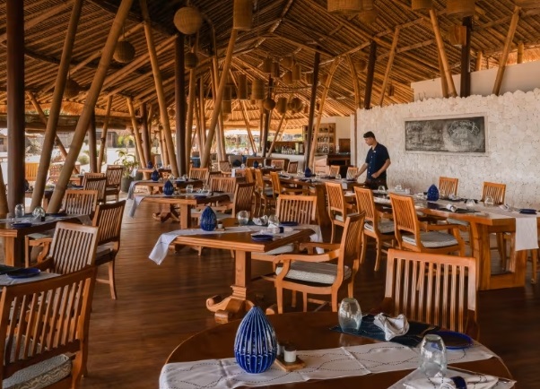 肉品則嚴選天然草飼牛與本地優質禽類,體現對永續、健康與土地的尊重。 餐廳主廚將地中海料理的清新手法與印尼島嶼風味巧妙融合,創造出一道道既富創意又深具靈魂的佳餚: 炙燒海鮮、香料慢燉肉類、搭配熱帶水果點綴的前菜與甜點,每一口都是陽光與海洋交織的味道。黃昏時分,坐在臨海座位,手中是沁涼調酒,眼前是橘紅天際,耳邊傳來海浪聲與細語風聲——用餐,成了一場多重感官的沉浸式體驗。
