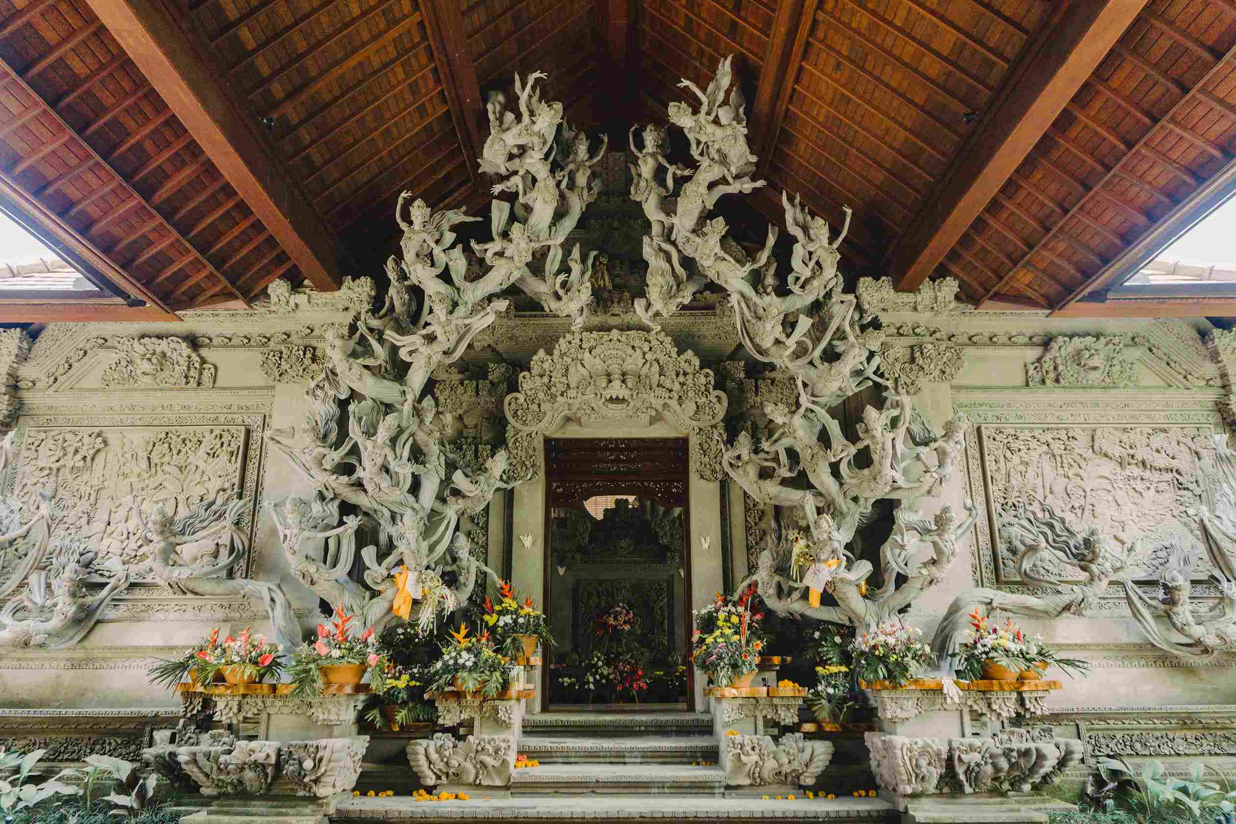 踏入園區,最先映入眼簾的,是一尊尊高聳入雲的**“Dedari”仙女雕像**。這些靈感來自峇里古老神話的石雕,姿態曼妙、神情莊嚴,為整片綠境注入靜謐而神聖的靈魂。在此用餐,不僅是享受美食,更像參與一場悄然進行的祝福儀式。