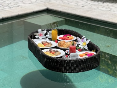 3. 美食饗宴:提供各式在地與國際美食,漂浮早餐(Floating Breakfast),在泳池中享用豐盛美食,開啟浪漫的一天。。