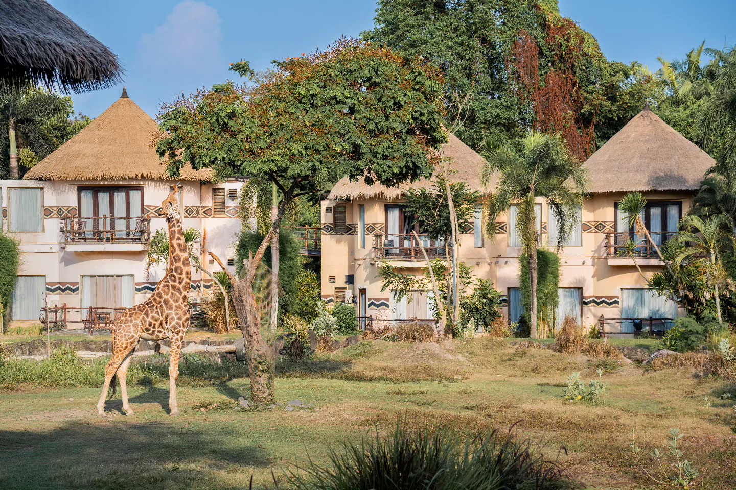 - 位於:當地四星飯店位於峇里島野生動物園(Bali Safari and Marine Park)內的 Mara River Safari Lodge Hotel,是一座結合野生動物園主題與度假村風格的獨特住宿地點,為旅客帶來前所未有的假期體驗。這裡以非洲大草原為設計靈感,讓賓客在入住期間仿佛置身於真正的野生動物世界中,沉浸於自然與野生動物的奇妙氛圍。整座度假村擁有 45間設備齊全的客房,每間小屋都設計成傳統非洲村落的風格,並附設 私人露天露台。從房間的陽台就能近距離觀察到動物園內自由活動的野生動物,如斑馬、犀牛、長頸鹿等,讓人不出房門便能與大自然零距離接觸,體驗真正的「野外探險」感覺。