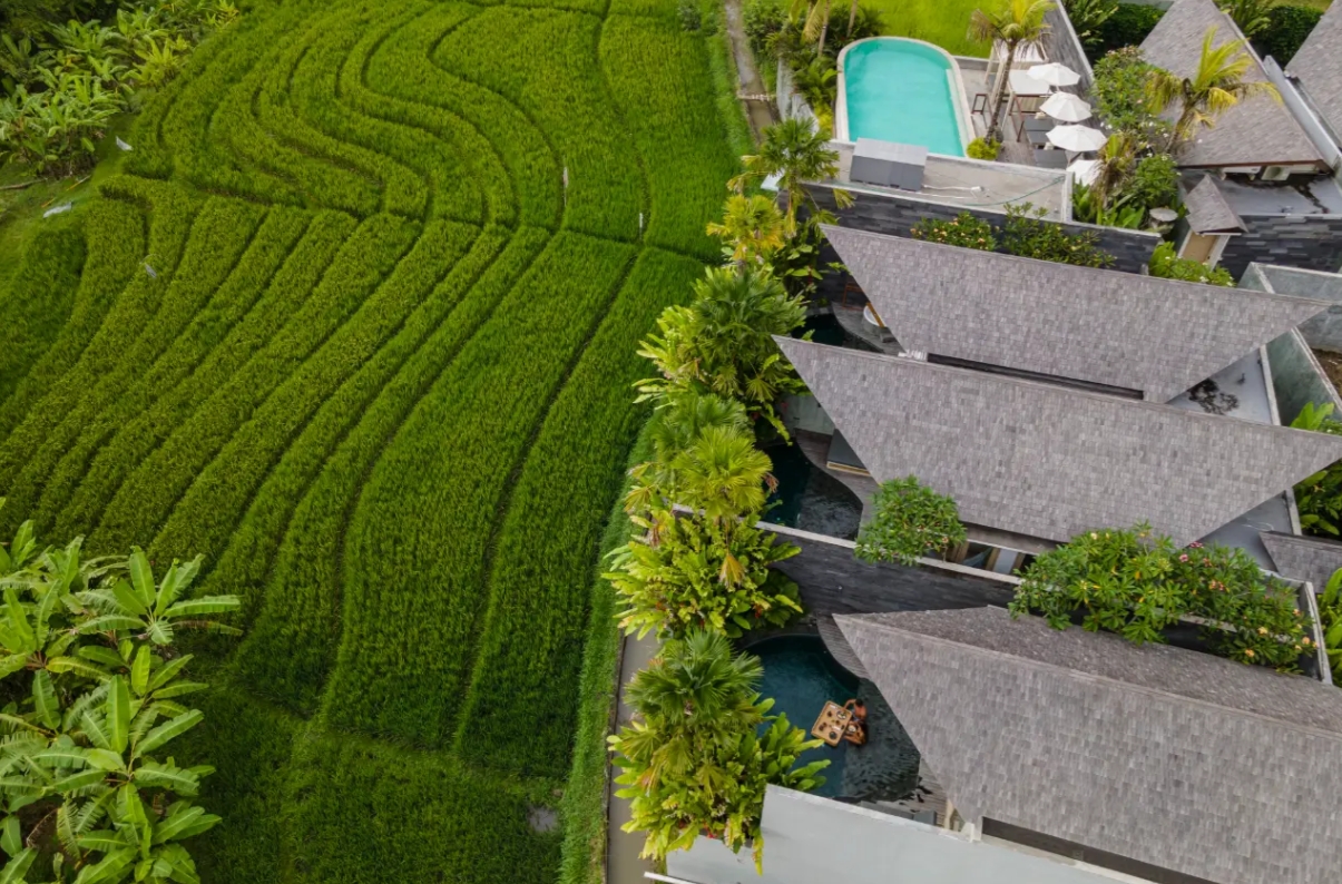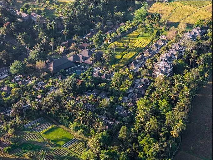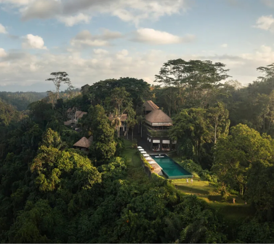 - 位於:奢華飯店度假村位於聖河帕克里桑河(Pakerisan River)山谷之上,周圍環繞著茂密的叢林和梯田景觀。設計靈感來自峇里島的「蘇巴克(Subak)」水利系統,象徵著人與自然的和諧共生。整個度假村以水為主軸,三條蜿蜒的泳池如同水道般連接各棟別墅,營造出如同村落般的布局,讓旅客在自然中感受寧靜與放鬆。