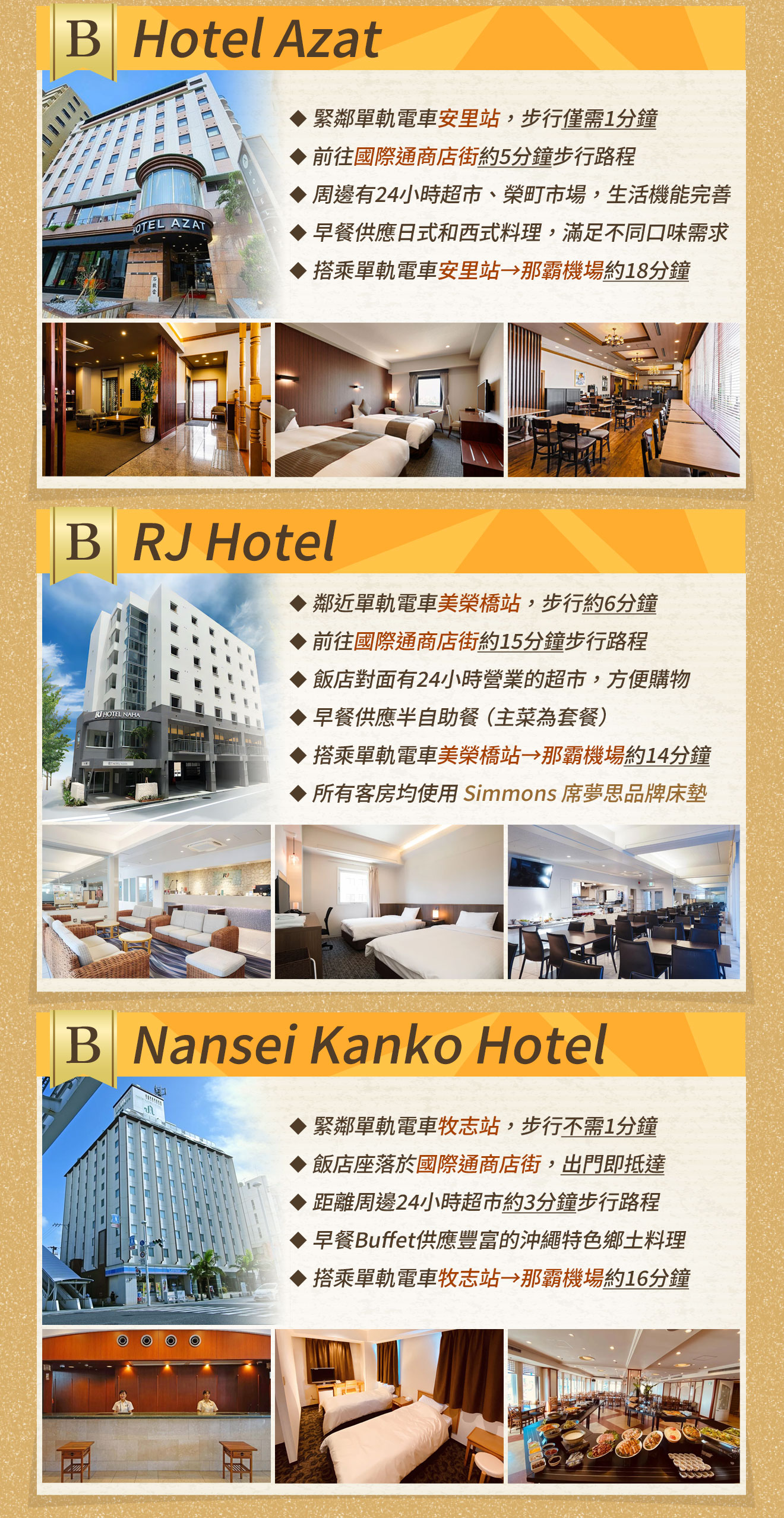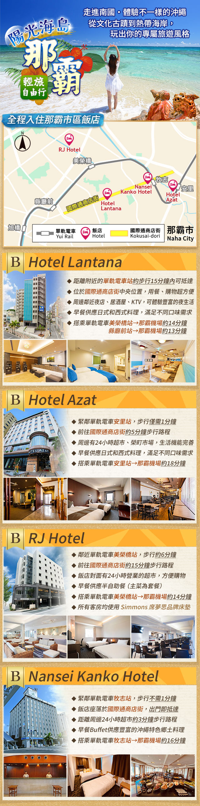 宿 B檔 Hotel Lantana(國際通街上) 或 Hotel Azat(近國際通) 或 RJ Hotel 或 Nansei Kanko Hotel 或 同級