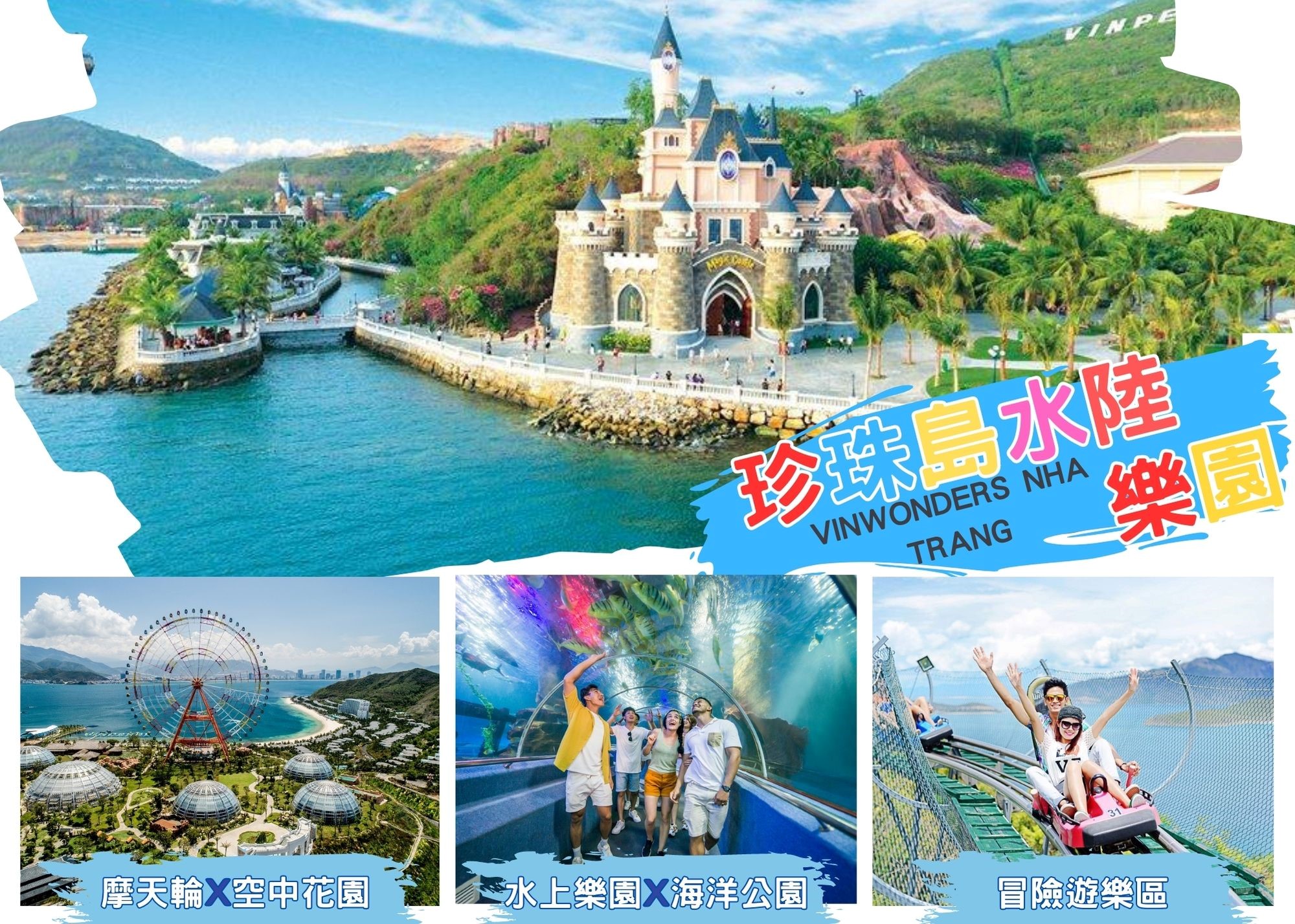 珍珠島水陸樂園渡假村(含樂園一票到底門票)越南最大的遊樂園,有東南亞迪士尼美稱。 精彩的樂園設施有: 過山車、自由落體、高山斜軌車、搖頭飛椅、大擺錘、礦山車等,摩天輪是樂園的新亮點(高200公尺),也是園區最新開放的熱區等活動精彩刺激,不限次數任君選擇。高山斜軌車是網紅推薦項目,一邊體驗刺激破表的速度,一邊欣賞芽莊灣美景喔! 動物展示園區: 佔地超過5公頃的超大園區,飼育著獅子、老虎、長頸鹿、猴子、犀牛、河馬、鳥園、各種可愛小動物等,還有空中餐廳(自費自理不含在門票內)、鳥園、動物表演等活動,每天下午14:30還有趣味動物表演,是全家大小都不能錯過的精彩節目喔! 摩天輪+五大空中花園: 培育世界各地珍品花卉植物,體驗世界前十大摩天輪,居高臨下看花花世界外,還可到觀海台看海或在花園區欣賞日本園林之美! 水上樂園+海洋公園: 大型水上樂園、兒童泳池、人工衝浪池、水上城堡、海豚表演館、海底世界等活動。園區擁有東南亞最大的泳池以及長達700公尺的私人沙灘,你可以選擇水上城堡樂園戲水、享受日光浴。 島上也有自費水上活動(請務必穿著救生衣並視自己體能和安全考量選擇): 水上娛樂、皮船、皮船玻璃底、飛行鞋、帆板、快艇拉浮動、快艇拉飛傘、摩托艇及與動物拍照(海豚、海獅、鳥),以上等皆屬自費項目。為方便遊玩,中餐敬請自費自理,您可到購物商場的美食區用餐,這裡也有城堡樂園(碰碰車、兒童樂園、室內電玩城、4D影院)、水幕表演劇院回憶童年時光,如果住宿珍珠島上,也還可參加音樂噴泉表演,每天19:00到19:25,特色音樂配上夢幻多姿的燈光,呈現浪漫童話氣氛,珍珠島讓遊客深覺不虛此行…。 *溫馨提醒:建議玩水旅客帶上泳具、毛巾,享受水上樂園設施。