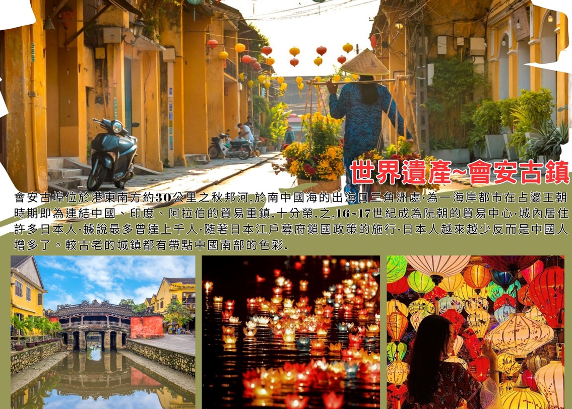 會安古埠位於峴港東南方約30公里之秋邦河,於南中國海的出海口三角洲處,為一海岸都市。在占婆王朝時期即為連結中國、印度、阿拉伯的貿易重鎮,十分繁榮。之後,16 ~ 17世紀成為阮朝的貿易中心,城內居住許多日本人,據說最多曾達上千人,隨著日本江戶幕府鎖國政策的施行,日本人越來越少,反而是中國人增多了。較古老的城鎮都有帶點中國南部的色彩。民家、會館、寺廟、市場、碼頭等各種建築沿著老街櫛比鱗次,特別安排遊覽十七世紀的古老城鎮--會安古鎮,此鎮位於峴港東南方約30KM處,為中古時代中國、印度、日本海運交易據點,因文化彙集交流,古老建築風格一直留存至,令會安古城古樸中帶點悠閒,感覺上有點像中國雲南的麗江。