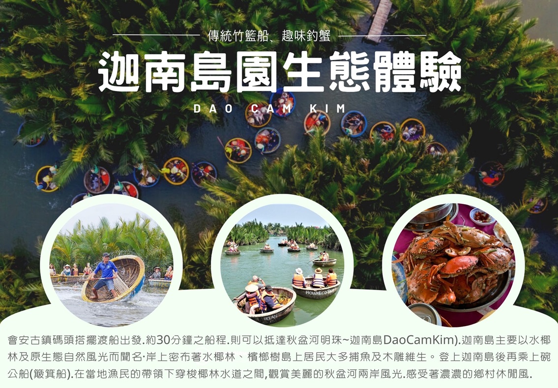 會安古鎮碼頭搭乘擺渡船出發,約30分鐘之船程,則可以抵達秋盆河明珠~迦南島(Dao Cam Kim),迦南島主要以水椰林及原生態自然風光而聞名。岸上密布著水椰林、檳榔樹,島上居民大多以捕魚及木雕維生。 登上迦南島後再乘上碗公船(簸箕船),在當地漁民的帶領下穿梭椰林水道之間,觀賞美麗的秋盆河兩岸風光,感受著濃濃的鄉村休閒風。放眼望去,河道裡星星點點的簸箕船,恰似秋盆河上的一道靚麗風景線。而越南特有的簸箕船在椰林海風中隨波逐浪,宛若在大海中一顆顆跳動的音符,譜寫著一曲漁家風情樂章。 漁民們之中會有一位技藝高超的漁夫獨自划船出來,開始在簸箕船上表演精彩絕技,只見漁夫將圓圓的簸箕船操控自如,將碗公船舞弄的旋轉翻飛,之後會挑選膽子大的旅人還可以一起參與表演,當漁夫將簸箕船劃得高速旋轉,上下左右翻騰,而遊客在船中則緊緊抓住船架,尖叫不已,刺激萬分,高超的技藝更是令遊客們的喝彩聲和掌聲不絕於耳。