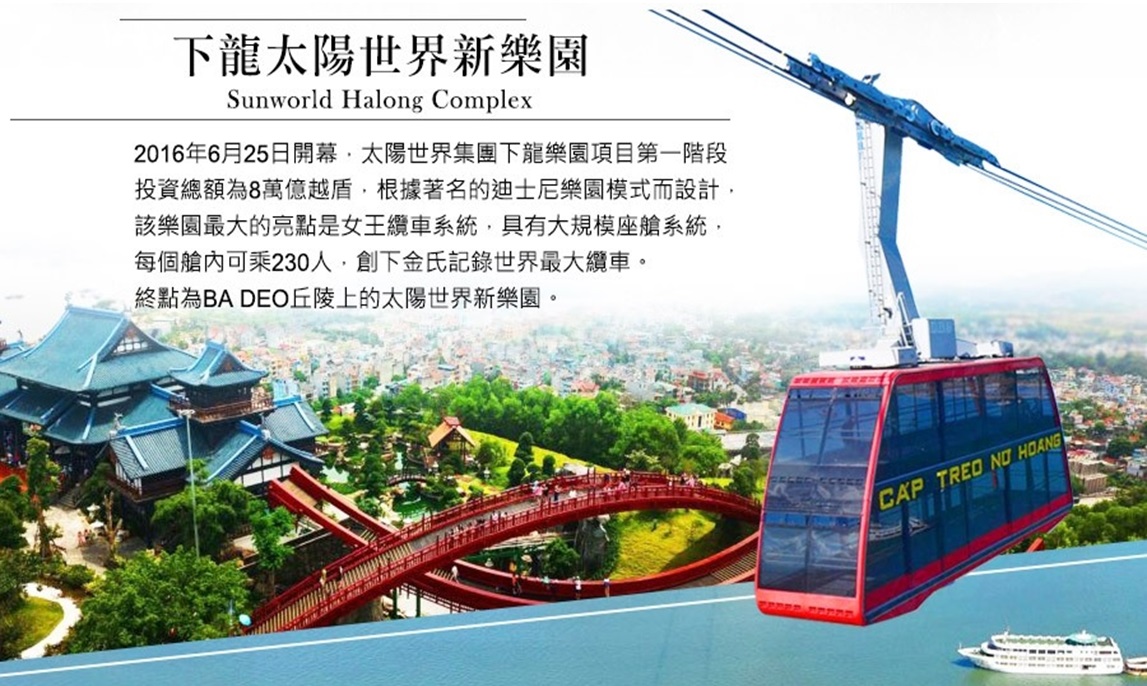 亞洲首創「下龍灣雙層景觀纜車」-2016年已獲得金氏世界紀錄認證為,全世界最大露天覽車(每個車廂可容納 230人,2016 年6月25日 由越南Sun Group 太陽集團所呈獻的全世界最大露天雙層纜車,此纜車分為上下層,下層為室內上層為室外,您可選擇站上上層看台享受360度視線完全不受阻,還能看到下龍灣海上石筍跟海灣美景,並可眺望鴻基島景色盡收眼底。(如因氣候關係或逢維修纜車停駛,現場退費USD10元或VND200,000元)