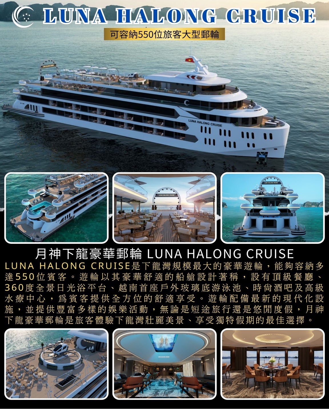 2024年11月LUNA HALONG CRUISE是下龍灣規模最大的豪華遊輪,能夠容納多達550位賓客,遊輪以其豪華舒適的船艙設計著稱,設有頂級餐廳、360度全景日光浴平台、越南首座戶外玻璃底游泳池、時尚酒吧及高級水療中心,為賓客提供全方位的舒適享受。遊輪配備最新的現代化設施,並提供豐富多樣的娛樂活動,無論是短途旅行還是悠閒度假,月神下龍豪華郵輪是旅客體驗下龍灣壯麗美景、享受獨特假期的最佳選擇。