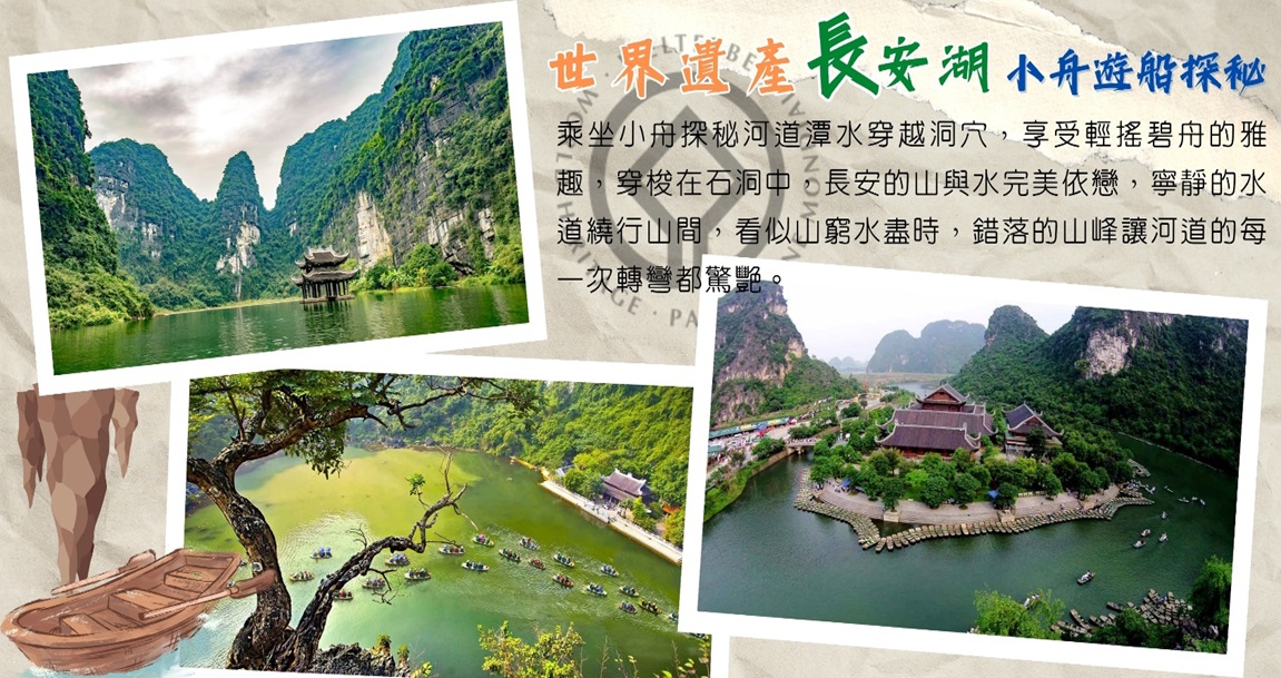 石灰岩綿延的長安喀斯特地形,約在2億4000萬年前形成,在此可乘坐小舟探秘河道潭水穿越洞穴,享受輕搖碧舟的雅趣,穿梭在石洞中,長安的山與水完美依戀,寧靜的水道繞行山間,看似山窮水盡時,錯落的山峰讓河道的每一次轉彎都驚艷。沿途自然是風光旖旎,蒼翠的群山,秀麗多姿的碧水,讓人有一種舟行碧波上,人在畫中游的感覺。 小鐵皮舟4人1艘,小舟行進間請勿站立及交換座位並務必穿上救生衣,每人船家小費2萬越盾已包含。 如遇長安生態保護區關閉、滿水位或人潮過多時,行程則改為三谷湖景區小舟遊船,敬請見諒。