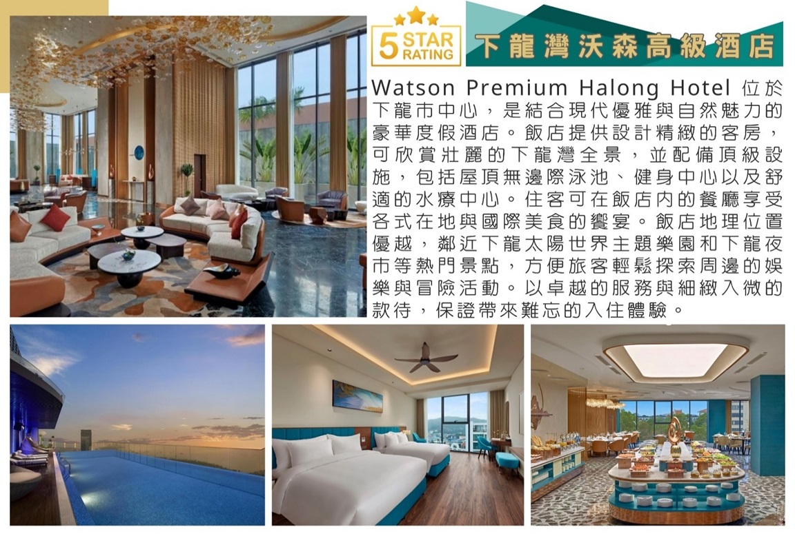 宿 ★★★★★The Watson Premium Halong Hotel 或 D'Lioro Hotel & Resort 或 下龍廣寧芒青飯店 Muong Thanh Hotel 或 中央飯店 Central Luxury Ha Long Hotel 或 同級
