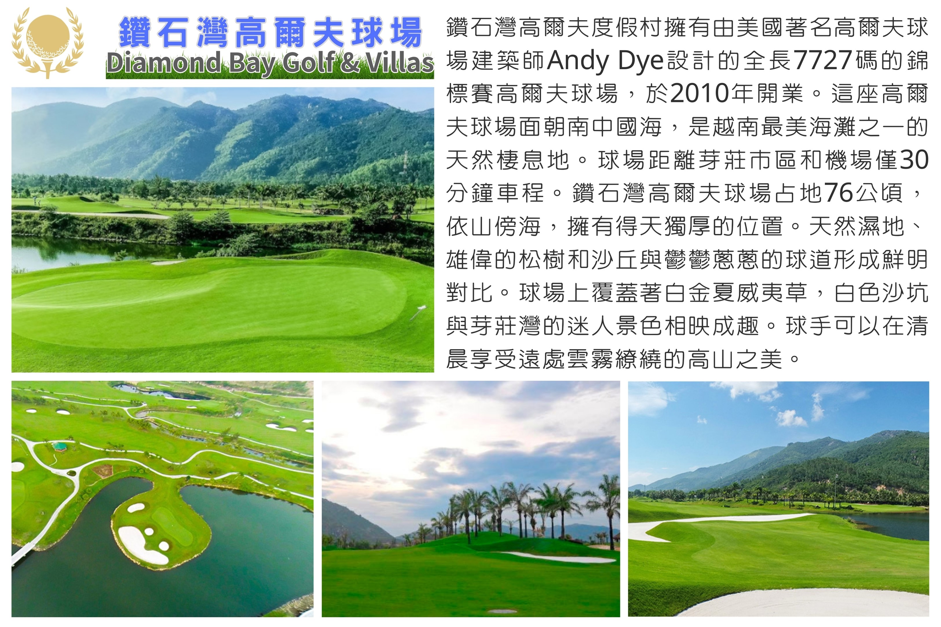 鑽石灣高爾夫度假村擁有由美國著名高爾夫球場建築師Andy Dye設計的全長7727碼的錦 賽高爾夫球場,於2010年開業。這座高爾夫球場面朝南中國海,是越南最美海灘之一的天然棲息地。球場距離芽莊市區和機場僅30分鐘車程。鑽石灣高爾夫球場占地76公頃,依山傍海,擁有得天獨厚的位置。天然濕地、雄偉的松樹和沙丘與鬱鬱蔥蔥的球道形成鮮明對比。球場上覆蓋著白金夏威夷草,白色沙坑與芽莊灣的迷人景色相映成趣。球手可以在清晨享受遠處雲霧繚繞的高山之美。
