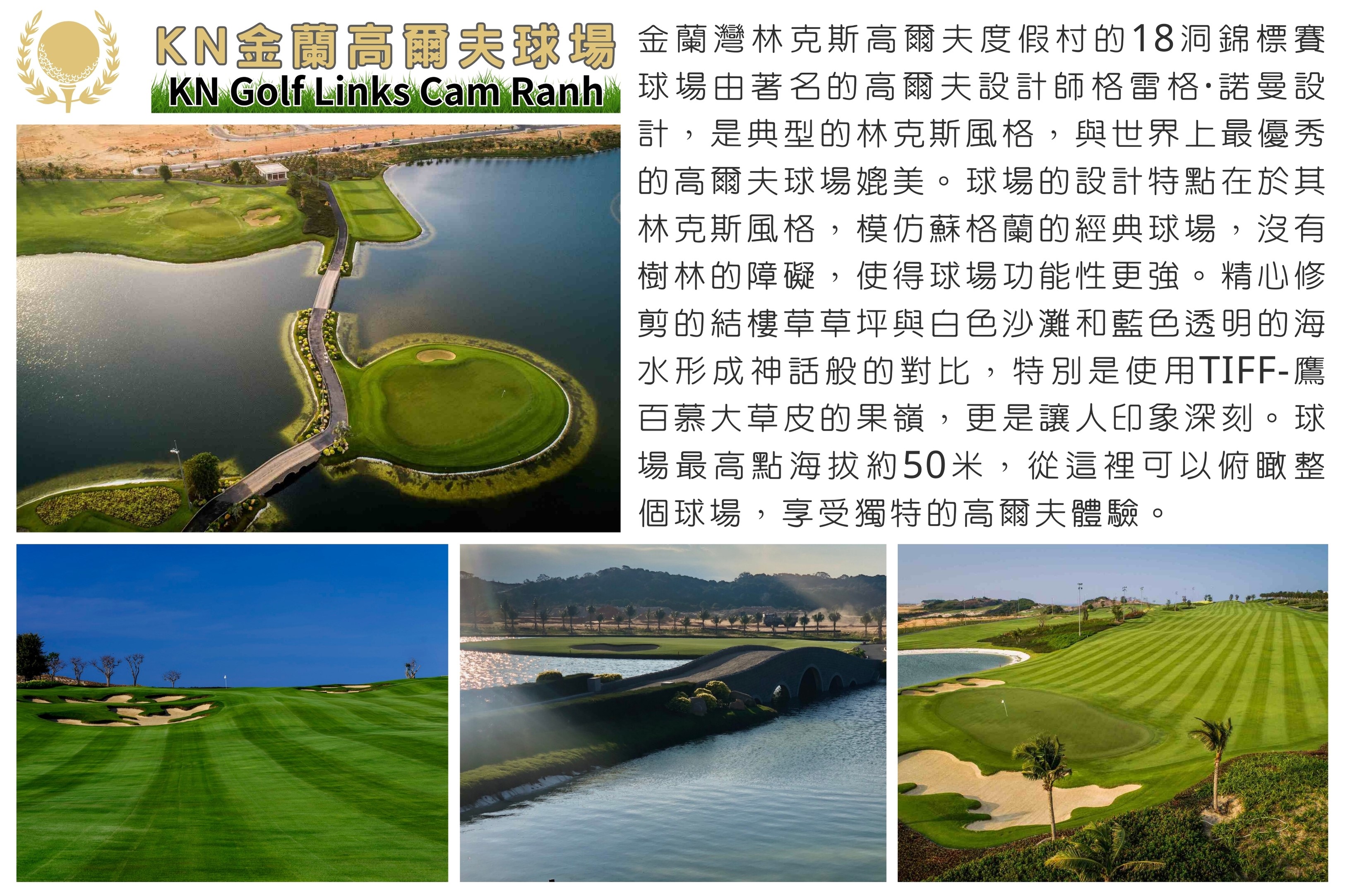 金蘭灣林克斯高爾夫度假村的18洞錦標賽球場由著名的高爾夫設計師格雷格·諾曼設 計,是典型的林克斯風格,與世界上最優秀的高爾夫球場媲美。球場的設計特點在於其 林克斯風格,模仿蘇格蘭的經典球場,沒有樹林的障礙,使得球場功能性更強。精心修 剪的結樓草草坪與白色沙灘和藍色透明的海水形成神話般的對比,特別是使用TIFF-鷹 百慕大草皮的果嶺,更是讓人印象深刻。球場最高點海拔約50米,從這裡可以俯瞰整個球場,享受獨特的高爾夫體驗。