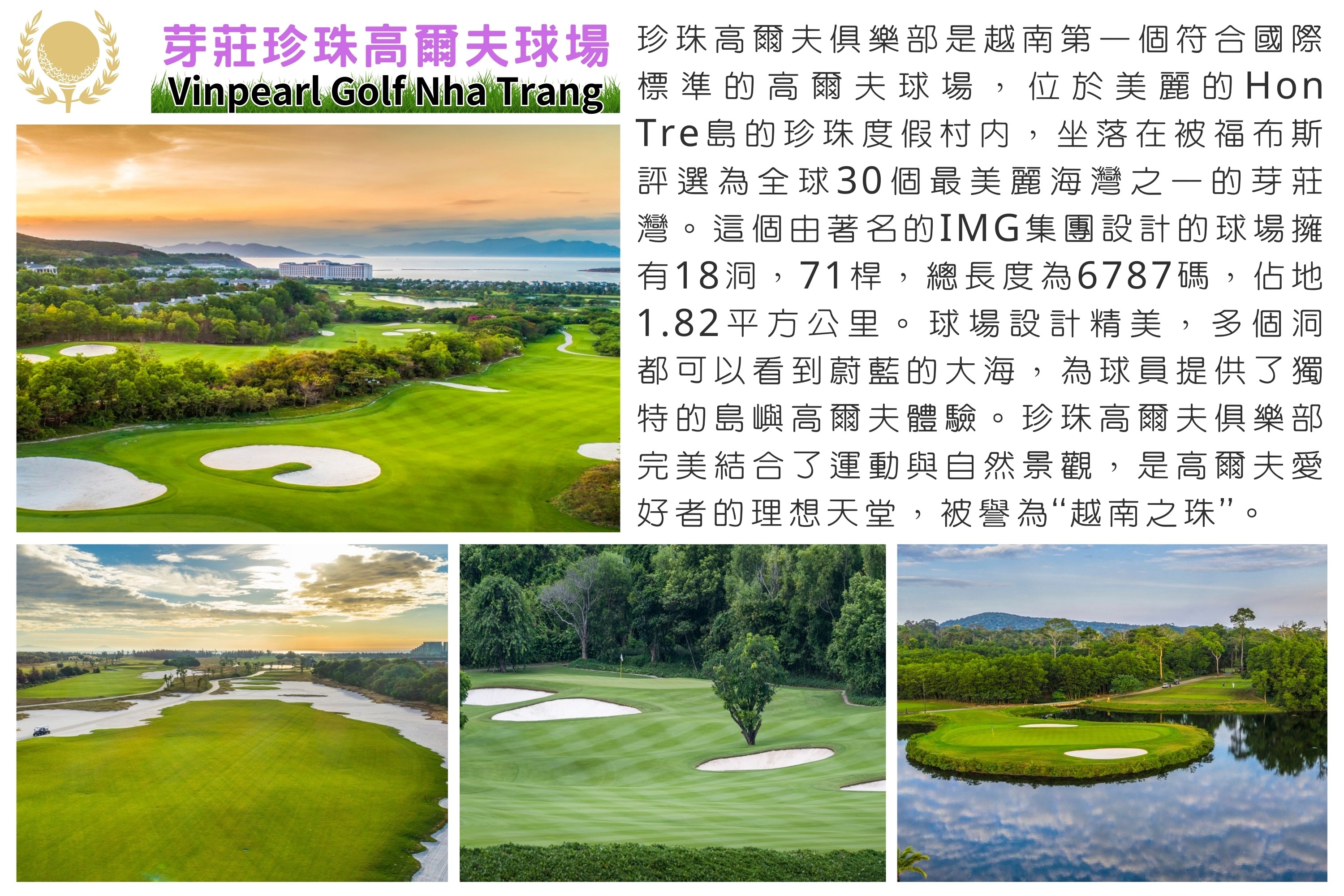 珍珠高爾夫俱樂部是越南第一個符合國際標準的高爾夫球場,位於美麗的Hon Tre島的珍珠度假村內,坐落在被福布斯評選為全球30個最美麗海灣之一的芽莊灣。這個由著名的IMG集團設計的球場擁有18洞,71桿,總長度為6787碼,佔地1.82平方公里。球場設計精美,多個洞都可以看到蔚藍的大海,為球員提供了獨特的島嶼高爾夫體驗。珍珠高爾夫俱樂部完美結合了運動與自然景觀,是高爾夫愛好者的理想天堂,被譽為“越南之珠”。