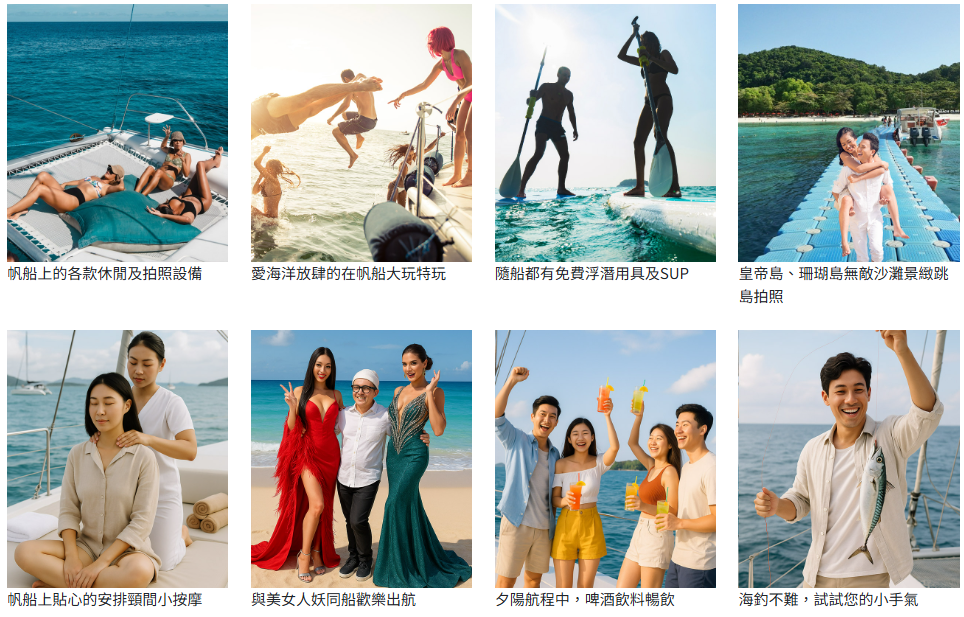陽光、揚帆、白沙灘—這次完整出現在你的限動上選要破表!在普吉島的一天,我竟然一次打卡了三座夢幻離島:皇帝島、珊瑚島、蜜月島,還搭上超浪漫的大型帆船出海浮潛,這才是真正的度假打開方式! 從碼頭啟程,乘著微風首先抵達了皇帝島。這裡的海水清澈如藍寶石,陽光灑在水面上,閃爍著如糖霜般的光澤。或者你可潛入海中,五彩斑斕的珊瑚世界令人目不暇給,小丑魚就在眼前穿梭,彷彿掉入了夢幻的海底童話。 午餐後是最期待的時刻──登上大型帆船前往珊瑚島。帆船行進間輕輕搖晃,海風迎面而來,讓人一秒進入放鬆模式。不想下水也沒關係,光是在甲板上拍照、發呆、享受免費肩頸按摩就已經值回票價。 而且行程內容超級豐富:SUP立槳、浮潛、海釣、海上滑梯、下午茶芒果糯米飯、啤酒飲料暢飲,還能與美女人妖拍照互動!最棒的是全程人數不多,就是私人包船般寬敞自在,完全不擁擠、無壓力。 帆船優點一次享盡 ①空間寬敞穩定,航行過程舒適不暈船 ②一次玩轉皇帝島+珊瑚島,雙跳島美拍不漏拍,浮潛天堂不容錯過,不下水也精彩!隨手一拍皆是明信片風景 ③船上還有免費肩頸按摩,邊吹海風邊放鬆,超享受! ④與美女人妖拍照互動:精彩華服登場,留下最具泰味的回憶合照 ⑤海上滑梯嗨翻天:從帆船直衝海面,刺激又消暑(依照船型安排) ⑥SUP立槳挑戰平衡感:站在海上感受如畫般的視角 ⑦海釣樂趣無窮:放下魚線,享受當地漁夫的樂趣 ⑧美食與美景雙享:下午茶時間精緻登場:甜香誘人的芒果糯米飯,搭配茶點,療癒味蕾,飲料啤酒無限暢飲:沁涼一夏,補足航行能量! 不論你是熱愛水上活動的探險家,或是想在甲板曬太陽、美拍美景的慵懶旅人,大型帆船都能滿足你對海島假期的所有想像!放慢腳步,享受普吉島獨有的快樂航海節奏吧!
