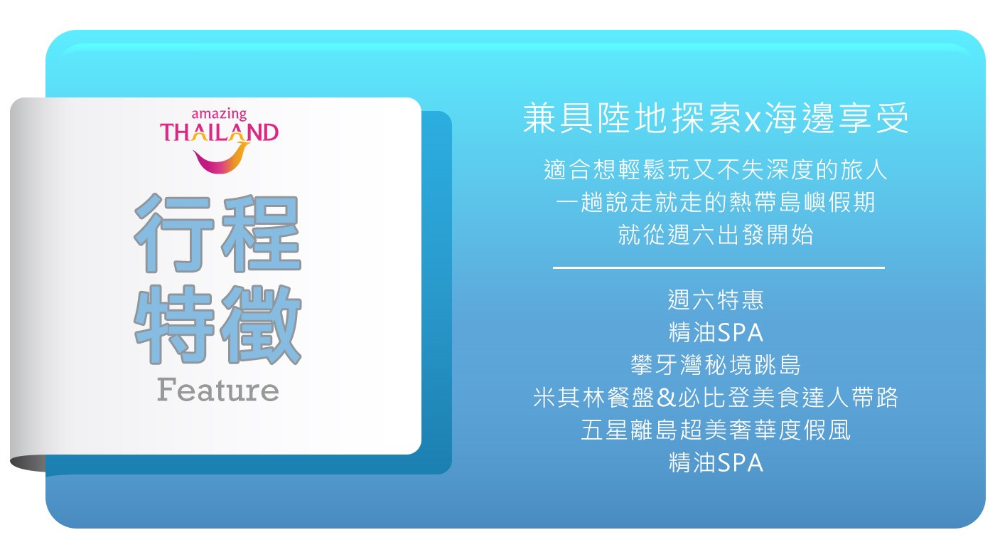 TOUR - 虎哩普吉特惠4日~五星離島超美奢華度假風、攀牙灣秘境跳島、米其林餐盤&必比登美食達人帶路、熱石精油SPA